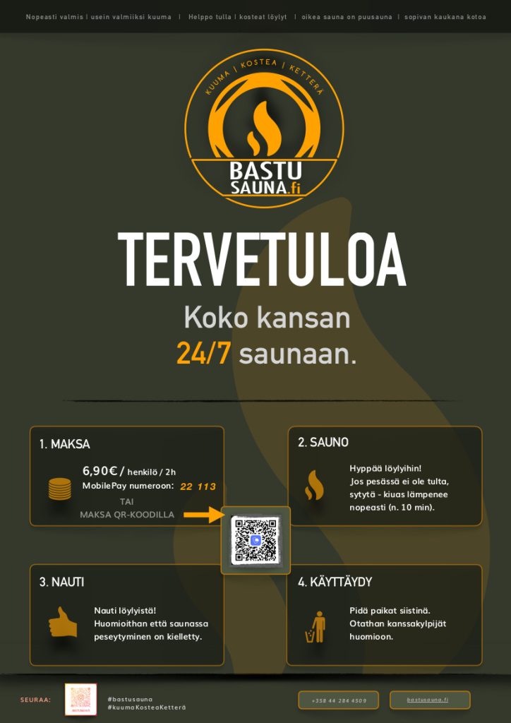 Bastusauna tarjoaa matalan kynnyksen saunomista Iin Vihkosaaressa sekä Limingan Rantakylässä. Saunamme ovat kaikille avoimia, eli ne eivät vaadi erillistä varausta tai ennakkolippua. Sinun tarvitsee vain suorittaa maksu (6,90€) MobilePayn kautta, jonka jälkeen pääset pian löylyihin – sauna lämpeää helposti ja nopeasti (n. 10 minuutissa) ja kiuas on helppo sytyttää puiden sekä sytytyspalojen ollessa valmiina. Parhaassa tapauksessa pääset suoraan löylyihin saunan ollessa valmiiksi lämmitettynä aiemmin tulleiden saunojien toimesta!